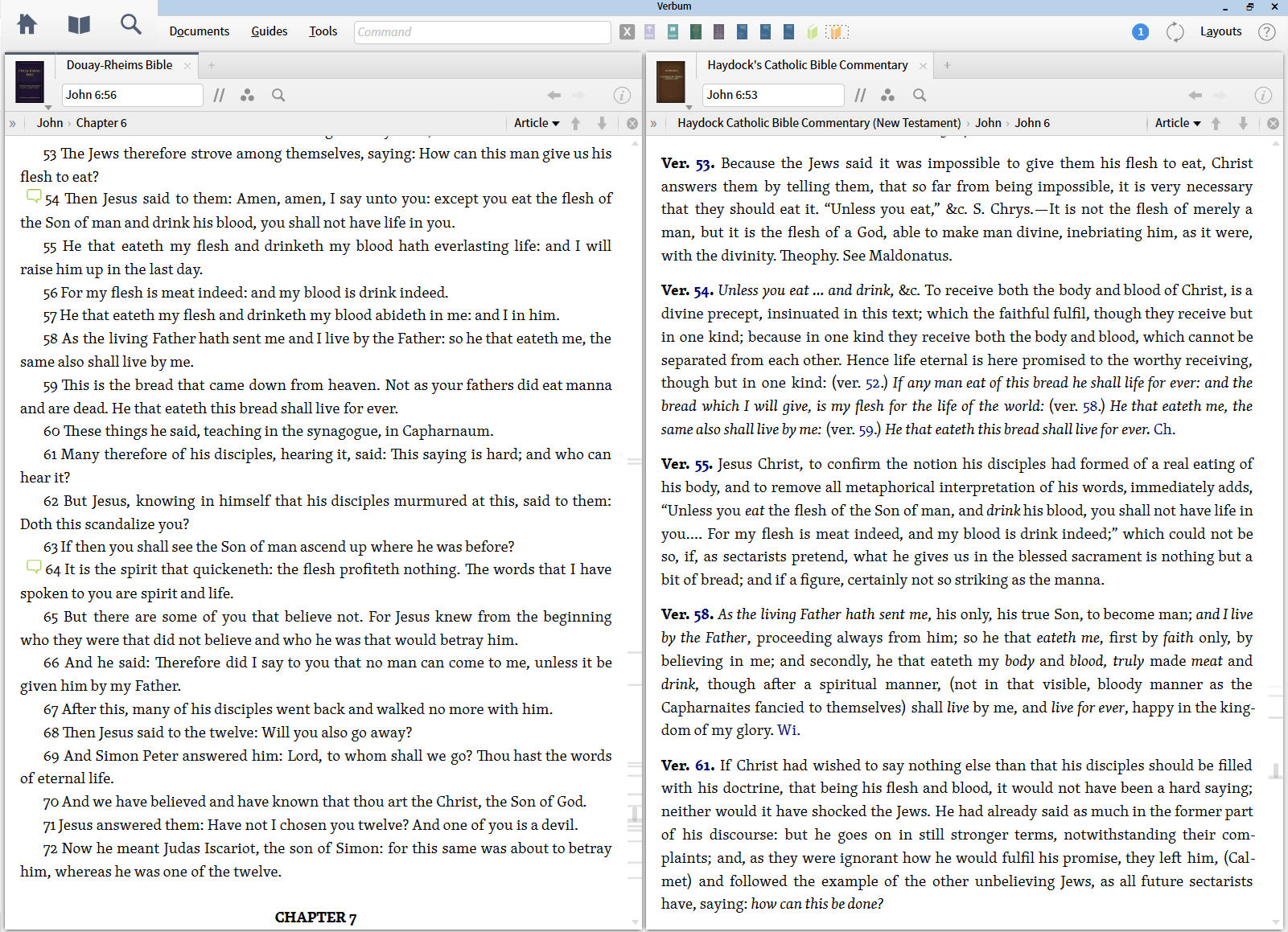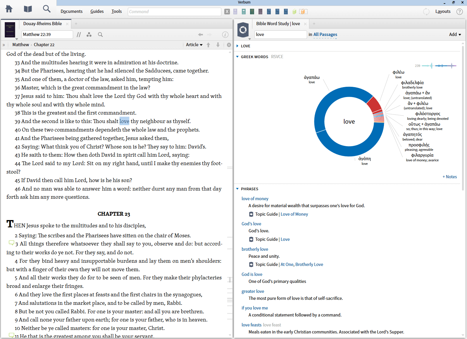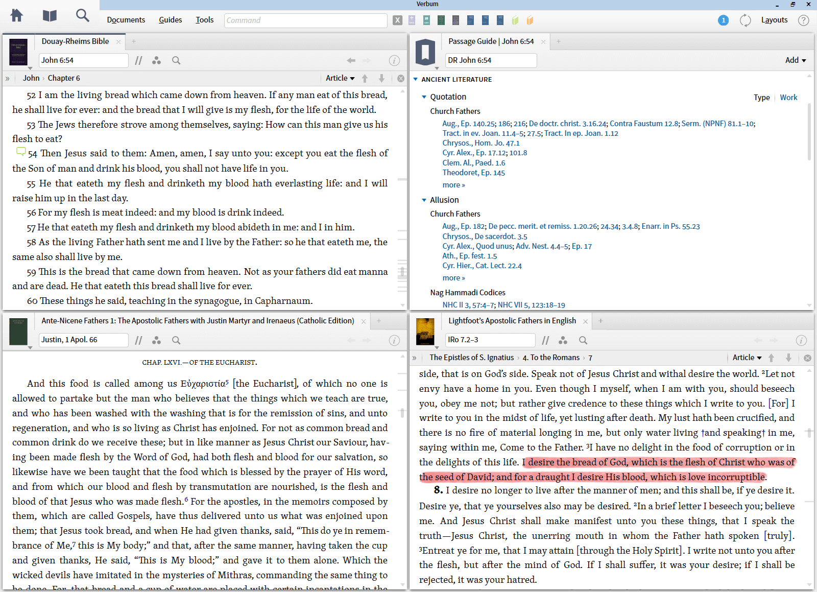 Verbum Cloud Premium gives you everything in Plus as well as select works from St. Alphonsus Liguori, St. Robert Bellarmine, St. Louis de Montfort, and Thomas Merton, English and Latin text of Encyclicals and Apostolic Exhortations of John Paul II and Benedict XVI, Vatican documents on doctrine, liturgy, education, and the family, the International Critical Commentary (New Testament), Karl Barth’s Church Dogmatics, works of Aristotle, Plato and other philosophers, and hundreds of other titles.